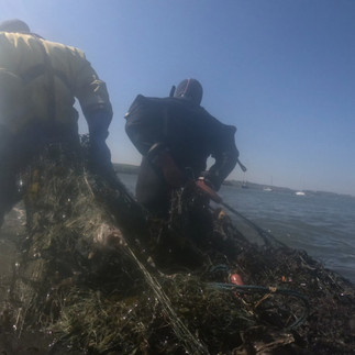 The team worked relentlessly in the muddy conditions, retrieving hundreds of metres of deadly netting and carefully cutting free any lucky live crustaceans to return them to the water, along with scores of marine life that hadn't been so fortunate.